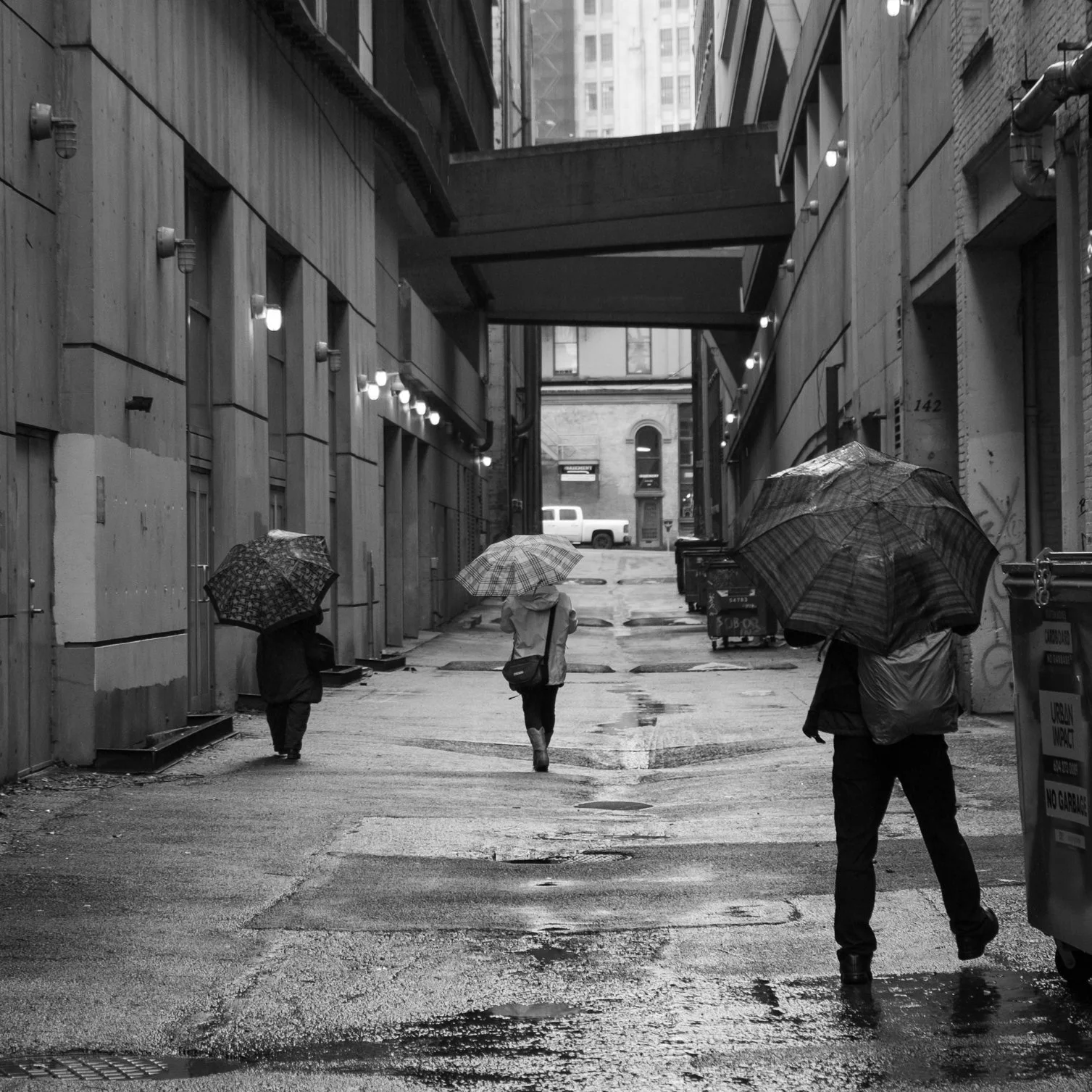 Cartier Bresson talks about the decisive moment in photography. The moment when subjects and surroundings align and you click the shutter to capture the image. Umbrellas are a theme in street photography. They add to an image and create a story. I was wandering around Gastown in Vancouver looking for images and this presented itself. I was lucky enough to click the shutter at just the right moment with umbrellas evenly spaced, walking down this alley, streetlights visible. I loved the geometry of the buildings and the bridges that connect them. The wet ground adds a nice touch as well.